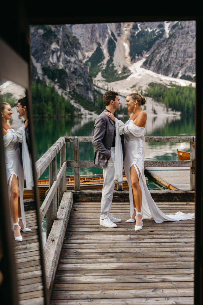However, the one thing you should never underestimate is the morning chill. Even in the height of summer, sunrise at this altitude is bracing. I highly recommend leaning into the “Alpine chic” look: think wedding capes, cozy throws, or even elegant wedding gloves. And when it comes to footwear, don’t feel pressured to wear stilettos. Many brides feel nervous walking on the wooden dock because of the gaps between the planks and the slight sway of the boards. Choosing a pair of cute hiking-style boots is a total vibe—they keep your feet warm, offer much-needed stability on the dock, and look perfectly at home in this rugged landscape.